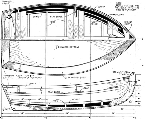 When finished, it is also light enough to be transported on a small trailer or on top of a larger vehicle. The boat plan calls for using hemlock or fir for the framing and oak or Douglas fir for the keel and chines.
